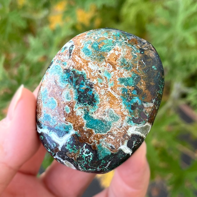 4.1×5.0×2.5 cm 104g 西オーストラリア 産 クリソコラ&マラカイトのパームストーン(磨き)です。 このピースは、クリソコラやマラカイトの他にも いくつかの銅鉱物が混ざっています。 (裏面には赤いキュプライトも見えます) そのため見た目よりもずっしりと重みがあります。 クリソコラ&マラカイトは様々な所で産出しますが、 「アースストーン」と呼ぶのは西オーストラリア産のものだけで、 クリスタルヒーラーのメロディさんによって命名されました。 鉱物名ではなくニックネームのようなものですが、 この石の個性やエネルギーにピッタリなネーミングだと思います。 見た目もエナジーも大地そのもの 握っているだけで安心感を感じるピースです。 【動画でチェック】 https://www.instagram.com/reel/DRWezYsE_-s/?igsh=MXR5a2lmeXE0cDFrMg== ※スマホから動画が再生しない場合は、 インスタを一回閉じた(終了)後にリンクをクリックしてください 【ご確認ください】 表面の細かいキズや凹みは天然石の特徴です。 商品の特性上、返品はお受けできません。 お使いの機器によっては画像の色と実物が 多少異なって見える場合もございます。 以上をご了承の上、お買い求めください。
